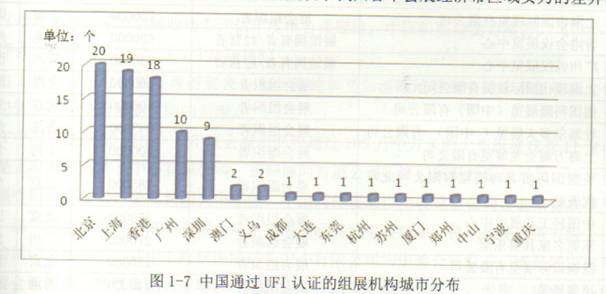 从中国目前的90家UFI会员机构区域构图中可以看出(见图1-7),排名前三的城市分别是北京(20家)、上海(19家)、香港(18家)、其次是广州(10家)、深圳(9家)、澳门和义乌(各2家)、东莞、厦门、成都、郑州、大连、苏州、杭州、宁波、中山和重庆各有1家UFI成员组展单位,从一定成都上反映了我国各个会展经济带区域实力的差异。