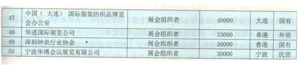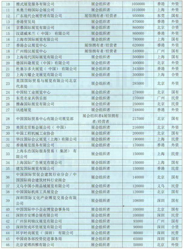 在中国组展商50强中,全年展会展出面积超过100万平方米的大型组展商有11家,他们分别是上海新国际博览中心有限公司、亚洲博闻有限公司、澳门贸易投资促进局、深圳会展中心管理有限责任公司、励展集团大中华区、中国对外贸易广州展览总公司、北京振威展览有限公司、法兰克福展览(香港)有限公司,中国国际展览中心集团、雅式展览服务有限公司、米奥兰特国际会展公司。其中上海新国际博览中心有限公司为中德合资企业,几时展馆拥有者,又是展会组织者;励展集团大中华区、亚洲博闻、法兰克福(香港)、米奥兰特军事外资会展公司;深圳会展中心管理有限责任公司、中国对外贸易广州展览总公司、中国国际展览中心集团为国有企业;雅式展览服务有限公司、澳门贸易投资促进局是澳门企业、只有北京振威是民营企业。可见,我国民营展览企业实力堪忧,