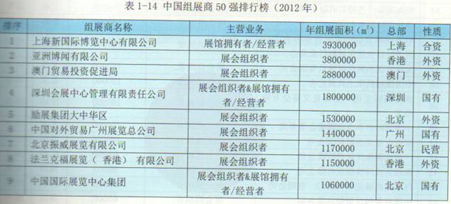 (数据来源:中外会展业动态评估年度报告课题组,中国组展商实力报告,《中外会展业动态评估年度报告(2012)》,P187-188)