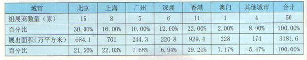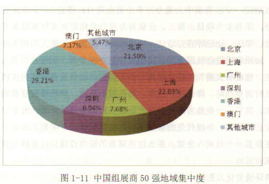 在展出面价方面,香港年组展面积打929.4平方米,29.21%,位居第一;上海第二,组展面积701万平方米/年;占比22.03%,北京第三,684.1万平方米/年,占比21.50%;第四是澳门,288万平方米/年,占比7.17%;第五是广州,244.3万平方米、年,占比7.68%;深圳220.8万平方米/年,分别为220.8万平方米/年,占比6.94%;其他城市(大连、东莞、宁波、义乌)则总共展出174万平法米,占比5.47%可以看出,香港、上海、北京三个城市的展出面积就占了总展出面积的60以上,可见地域集中度已经相当高。