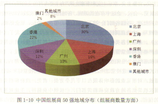 在组展商数量上,亿北京、香港和上海的组展商实力最强。在50强中,北京占据15家,占比30%,排名第一;香港11家,占比22%,排名第二;上海8家占比16%,位列第三;第四是深圳,有6家,占比12%广州第五,有5家,占比10%,澳门1家,占比2%,、其他省市(大连、东莞、宁波、义乌)共4家,占比8%。从比例上看,香港与北上广深占据绝对优势,绝大多数的组展商都集中在这几个中国最发达的城市。
