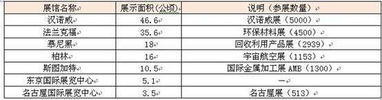 德国有22个国际展馆,下表为德国几个展馆与日本两大展馆的对比数据。由此可见,号称世界最大的汉诺威展馆的展示面积是名古屋国际展览中心展示面积的13倍多。而德国国内相对较小的斯图加特展馆,其展示面积也是号称日本展示面积最大的东京国际展览中心的两倍多。
