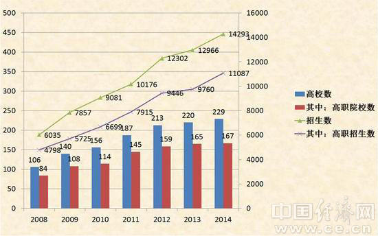 2014年,全国开设会展专业的高等院校为229所,其中高职167所,占72.9%;招收新生14293人,其中高职11087人,占招生总数77.6%。会展院校数和招生数历年变化情况见图2。