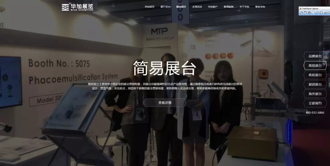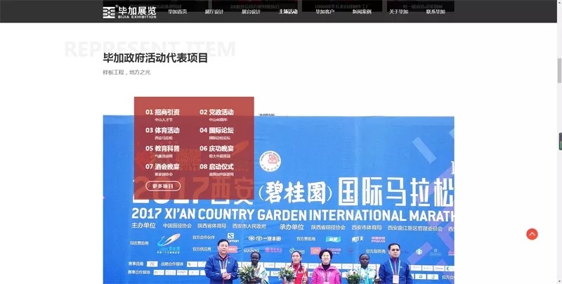 接着就是依次从展厅设计到展台设计再到主场搭建,以提供客户需求为己任,每个版块分为五个详情页面,总共15个页面,提供给客户进行参考,细阅。每个详情页面都有明确展示所需展会案例,让整个网站具有国际化。