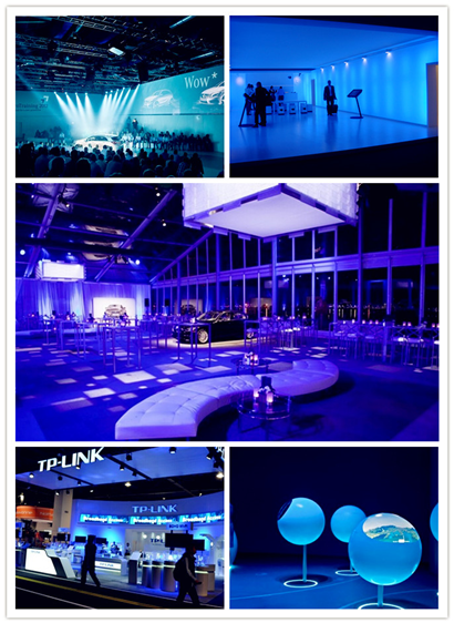 展会展台的面积普遍比较小,一个专业的设计师会懂得巧妙的运用灯光来改变狭小空间。例如将墙面用灯光打亮就会令空间显得较为宽敞。对展台,特别是营销型展台,由灯光来改变展会的空间时常会带来一些意想不到的效果。