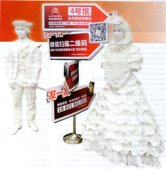 为了吸引观众的眼球,展商们可以说是无所不用其极,两位风格怪异,全身煞白的“石膏像”竟然在展会现场“活”了起来,而且还在积极地招揽观众!前来求合影的观众自然是络绎不绝。