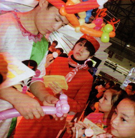 展台人员的可爱小丑扮相吸引了小孩子的眼球。小丑能应孩子的要求将手中的气球捏成各种形状,小孩子惊奇于小丑的“魔法”,久久不愿离开,展台被这群可爱的孩子围得水泄不通,吸引孩子的注意力是提升展台人气的一大法宝。