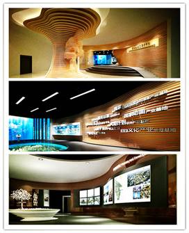 3、展厅文化设计。通过空间形象塑造将某种文化氛围或色彩符号运用于空间设计之中,创造出在某种文化氛围下的展厅环境,让观展者的情绪受环境的影响,对展示品及展品所属的地区或企业的理解加深,从而对展品留下深刻的印象。